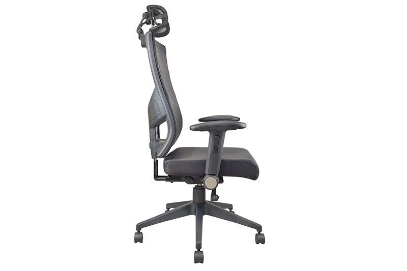 メッシュバックとPUシートフォームデザインのオフィスチェア。椅子のシート、椅子の背もたれ、ヘッドレスト、アームレストに複数の調節機能が付いています。