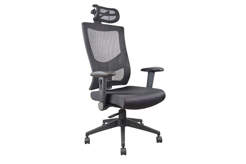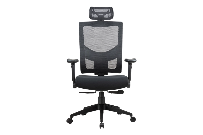 メッシュバックとPUシートフォームデザインのオフィスチェア。椅子のシート、椅子の背もたれ、ヘッドレスト、アームレストに複数の調節機能が付いています。